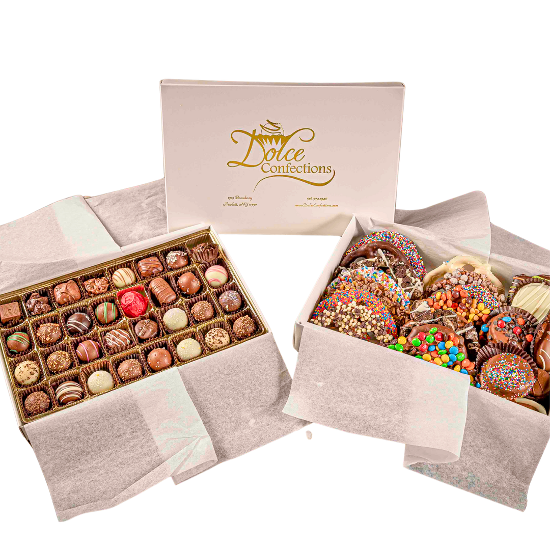 From classic truffles to chocolate-covered pretzels, cookies, and foiled assortments, our per-pound options let you choose exactly what you love. Packaged fresh and kosher-certified, each pound is perfect for gifting, sharing, or keeping stocked at home. Mix and match your favorites — or enjoy a box of just one sweet indulgence.
