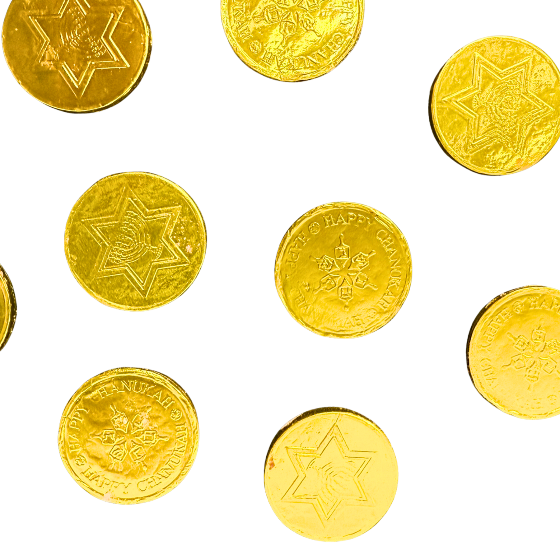 Assorted Hanukkah gelt coins and foiled star chocolates